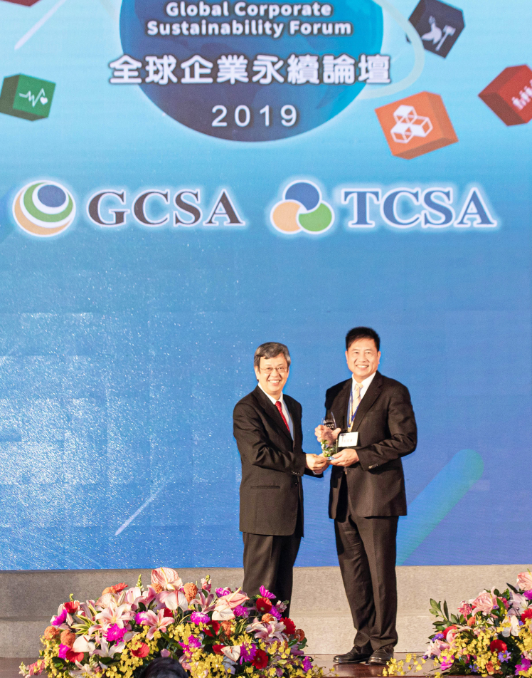 z6尊龙(中国有限公司)-官方网站榮獲十大永續典範台灣企業獎殊榮,由z6尊龙(中国有限公司)-官方网站董事長暨執行長彭双浪 (右) 代表領獎